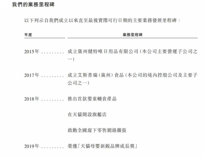 在很多消费者印象中,爷爷的农场是一个“荷兰进口”辅食品牌,但根据招股书,爷爷的农场所属集团于2015年启动运营,运营主体为广州健特唯日用品有限公司,法定代表人为姜福全。2017年,成立艾斯普瑞(广州)食品有限公司。2021年10月,在开曼群岛注册成为获豁免有限公司。天眼查信息显示,目前广州健特唯日用品有限公司由艾斯普瑞(广州)食品有限公司100%控股。招股书也明确写道“我们以自己的品牌‘爷爷的农场(Grandpa’sFarm)’销售产品”。